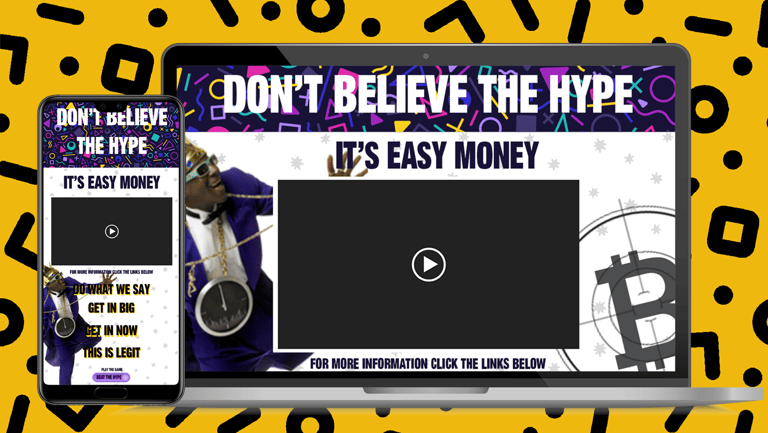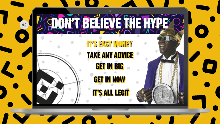 In a serious of hilarious TVCs, he'd intercept a range of avoidable crypto blunders, by popping up and rapping ‘Don’t Believe The Hype’, before directing you to an educational website (cryptosense.com).
